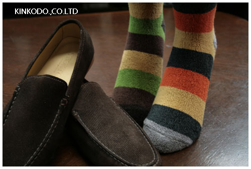 茶色のヌバックのスリッポンにボーダーのソックス。となりますとパンツはツィード系になるのでしょうか。ここは色だけではなく素材のボリュームも統一感が欲しいところです。靴下がこんな感じだと上はセーターなどのカジュアルウェアになりますが。