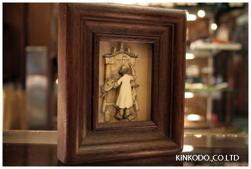 こちらの額。何故当店にあるかと申しますと、額がポイントではありません。それじゃ中で絵を描いている人がポイントかと申しますとそうでもございません。描いている絵がたまたま帆船でしたので、金港堂のロゴマークにもあります。帆船と重ねて購入したものと思います。さて、この額がどこに飾られているか?ご来店いただいた方は探してみて下さい。