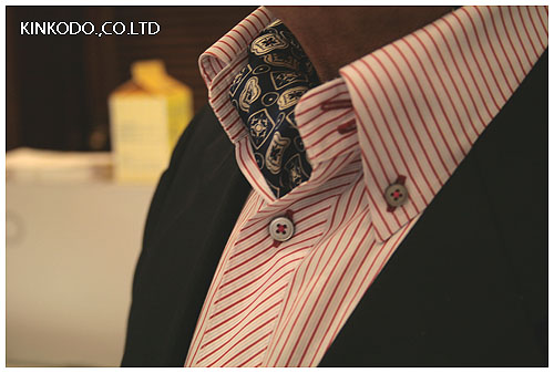 赤の細いストライプで、衿はボタンダウン、そしてドゥエボットーニ。特徴は衿を通常横に流れるのに対し、縦取りにしそして前立てを斜めにとりました。写真では写っておりませんが、カフスも斜めに取ってあります。今日は紺のスーツにアスコットタイを着用。