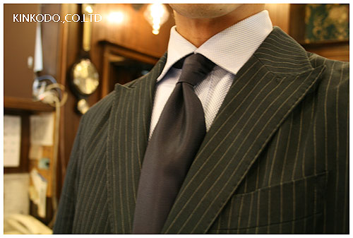 綿のスーツなのですが、細いストライプでピークラベルです。カンクリーニのざっくりとしたオックス調のシャツ生地をワイドスプレットホリゾンタルの衿にし、そしてソリッドタイ。スーツがストライプなので、タイは押さえました。まぁ若干季節感が?と言う感じはしますが、スーツは綿素材でシワにもなっておりますので、色が濃くても清涼感はあると思います。もっともネイビーではなくてもっと柔らかな色合いのソリッドタイでも良いとは思いますが、ちょっとシックな装いで。
