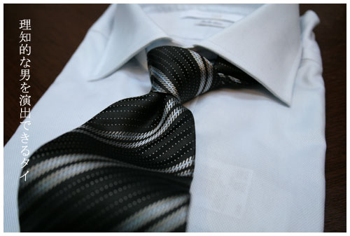 理知的な男を演出できるタイと付けましたが、私のイメージから言いますと、高層ビルにオフィースを構える会社からランチに外に出てくる有能なビジネスマンは、ビル風にあおられてスーツの中のネクタイが揺らいでいる印象が強いのです。その時のネクタイって、プリントの象さんや、ワンちゃんじゃなくてモノトーンのストライプ系だ。いやそうあるべきだと勝手に思いこんでおります。