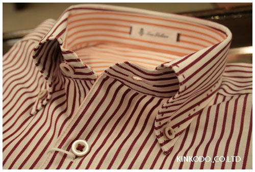 こちらのシャツ。衿の裏側がピンク色しておりますが、特別ピンクの生地を貼った訳でもなく、赤のストライプの裏側がピンク色した生地を使用。
