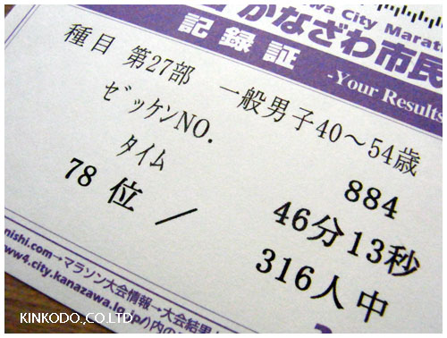 先日の「かなざわ市民マラソン」の結果が送られてきました。まぁ無理やりのネタですが。