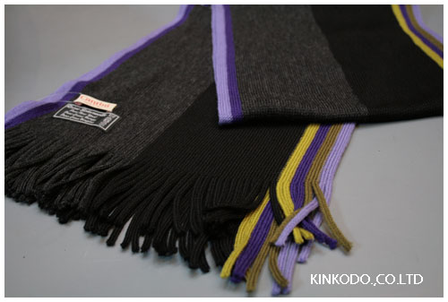 写真をご覧になって頂ければ分かりますが、センターは黒とグレーの落ち着いた色合いですが、左右はパープル系。このマフラーの特徴は右と左とで縁のストライプの数が違うのです。