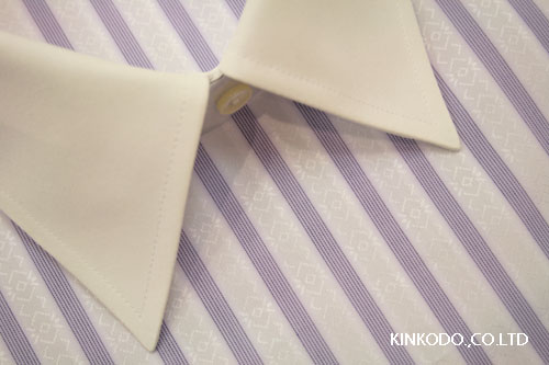 ということで、本日は新柄のご紹介。ちょっと変わったと言いますか珍しい柄です。パープルのストライプの間にドビー柄があるのですが、そのドビー柄がまた面白い。