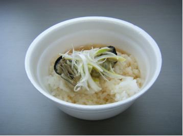 能登マ丼と言うらしいです。能登和倉万葉の里マラソンの第7エイドで1000杯振る舞われるそうです。ご飯の上に、ゆで牡蠣を2個のせて→能登ネギをのせて→特性のあんかけをのせて→完成。スプーンでかき込む。