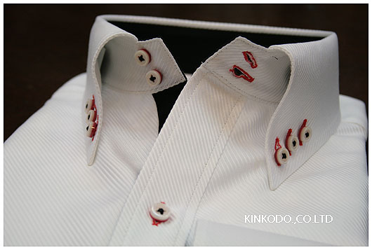 ベースはカンクリーニのツイルの生地を使っております。先ずはボタンのご説明から。裏半分が赤色のプラスッチクボタンでボタンホールは赤、ボタン付け糸は黒、衿に付いているボタンダウンの3つのボタンの一番手前はボタンホールも開けてありますが、残りに2つはダミーです。