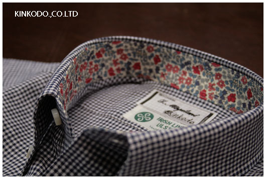 衿型はボタンダウンですが、あまり大きい衿にしませんでした。さり気なく、ラフなカジュアルにしようと思いまして。衿の裏にはリバティープリントを入れておりますが、前立て部分には今回いれませんでした。