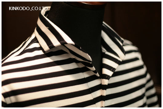 特徴はフロントのボタンが無いのです。それでも衿が極端にひろがる訳でもなく、そして衿がねてしまう訳もなく綺麗な弧を描くのです。