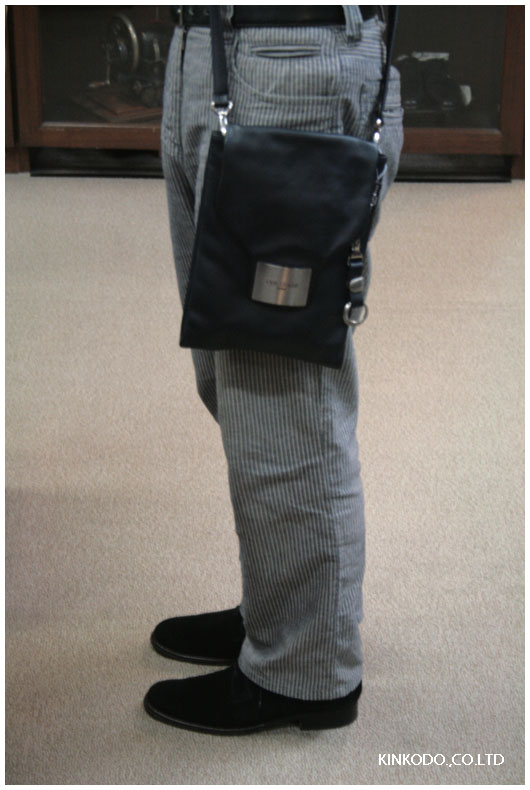 今このような薄いレザーポーチが流行ですよね。本当は横じゃなくて、お尻の上のちょっと乗せた感じでかけて頂くと良いかと思います。