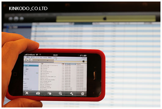 パソコンをiPhoneから操作できる。驚き。iPhoneからiTune立ち上げて音楽鳴らせました。iPhoneに映っているiTuneは奥の私のパソコンの画面なのです。勿論クリックもできますし、文字だって打てます。