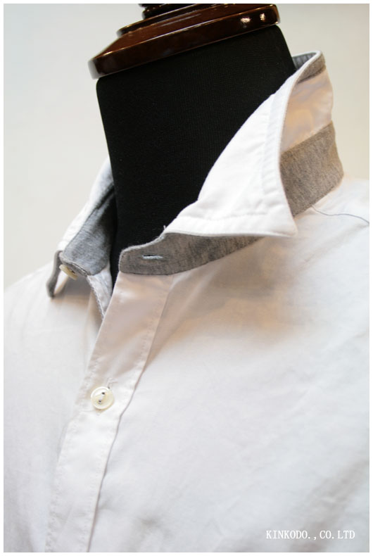 今日のシャツは白のピンオックスの生地にグレーのニット調の生地を衿裏や、ポケット、カフス、下前立ての表、剣ボロ、裾、そして裾のピースに至るまでパインピングと生地の貼り付けが行われています。