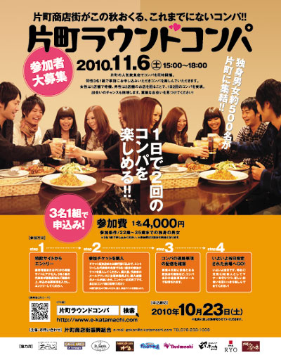 片町商店街主催の合コン。まぁ行政だってお見合いパーティーやっているくらいですし、商店街がやってもおかしくはない。むしろ積極的に出会いの街にしていくべきだ。ということで。