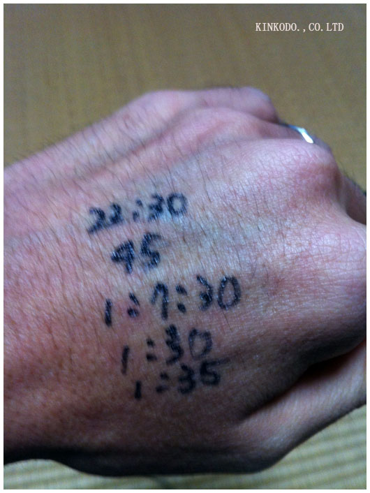 5キロ通過が22分32秒。手の甲に書いた予定とほぼ同じ。キロ4分半で走れていることを確認しました。