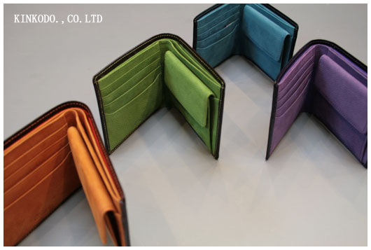 小銭入り付き二つ折り財布です。牛革で、内側はヌバック素材。カラフルな4色を揃えました。