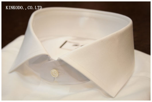 当店のホリゾンタルワイドよりも更に開きを広くしてほぼ水平に持っていきます。そして衿先を通常の9センチから7.5センチにさせて頂きました。