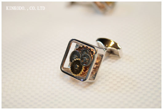 いや機械じゃありません。カフスなんです。4枚の歯車、後ろの1枚を入れると5枚になるのですが、その歯車を四角いケースの中に閉じ込めたケース。