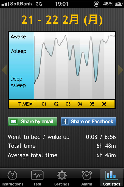 枕元にiPhone置いて、アプリ立ち上げて寝るだけなんですけど。寝返りうつとiPhoneの加速度センサー働いて熟睡してないと感ずるらしく。昨晩の私は12時08分に寝て、そのまま熟睡モード。4時頃またぐっとねて、5時頃更に熟睡って感じでしょうか。