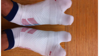 タビ型のソックス。当店でもソックス売ってますが、まぁランニング用のソックスを販売している訳ではないので、ご紹介。絶対にお勧めします。5本指もありますが、私はこのタビの形がお勧め。ランニングソックス指先でしっかりと地面を掴む感じがします。5本指は今までもありましたがタビと言うものが日本にあり、それが何故タビなのかが良く分かります。金沢では百番街の靴下屋さんで販売しているそうです。