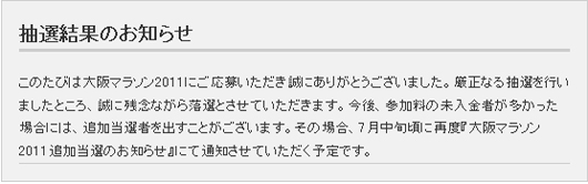7名で10万円というチームエントリーチャリティー枠で申し込んだのに。一緒に申し込んで頂いた皆さん本当に申し訳ありません。全ての責任は私にございます。東京マラソン5回連続落選。その実績を持ったまま大阪マラソンをチームエントリーしてしまいました。