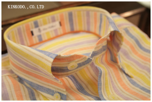 麻のマルチカラーのストライプ。衿裏はストライプを縦にとってあります。見えないところではあるのですが、着る瞬間も楽しみたいですからね。勿論第一ボタンを外すと衿裏が見えますから、ファッションに敏感な方は通常とは違うデザインに気付いてくれることと思います。