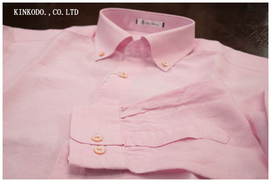 ピンクの麻のシャツ。これにグレーのパンツとの組み合わせ。ばっちりです。これで夏を乗り切りましょう。