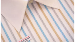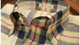第一ボタンが無いデザインです。ネクタイはしない前提ですから問題ありません。今ピンで第一ボタンのところを止めて、衿を閉じた感じで写真を撮ってあります。第二ボタンより衿台に向けてのラインが斜めになっているのが分かるかと思います。第二ボタンのこの位置から開いていくように裁断をしてあります。