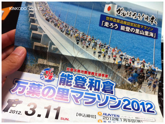 今日届いていました。能登和倉万葉の里2012.3月11日本当に良い大会です。私3年間連続で出走してます。ただこの日京都のフルマラソンと重なるのです。実はそちらも申し込んでいます。多分落選すると思いますが(笑)今月末には東京マラソンの抽選発表もありますしね。今年落ちたら6年連続です。