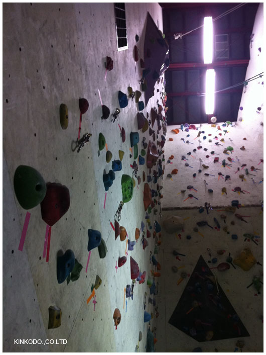 最初は普通の壁で低い所から、綱を付けずに。それでもちょっと壁が斜めになったところだと僅か3メートル上でも上れません。