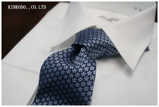 ネイビーベースにブルーの小紋(花柄)白のシャツでも良いですが、ブルーのロンドンストライプのシャツに合わせても綺麗だと思います。