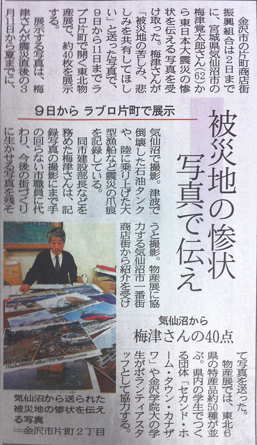 来週の金曜日から日曜日9日~11日にかけて、片町商店街のラブロにて商店街主催の震災復興支援の東北物産展を開催させて頂きます。東北で被災した工場もありますが、別の地で立て直し既に販売を始めているお店もあります。そのようなお店から商品を取り寄せ、震災のパネル展示とともに物産展を開催します。お時間のある方は是非。