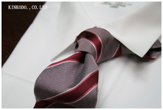 すっきりとした赤系のネクタイ。赤だとどうしても暗くなりがちですがベースの色を明るめに。Vゾーンを明るくしてくれるネクタイだと思います。