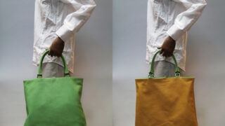 上の写真は同じバッグなのです。ひっくり返すとグリーンがイエローになります。持ち手をご覧になって頂ければイエロー側でもグリーンの持ち手になっているのが分かって頂けるかと思います。