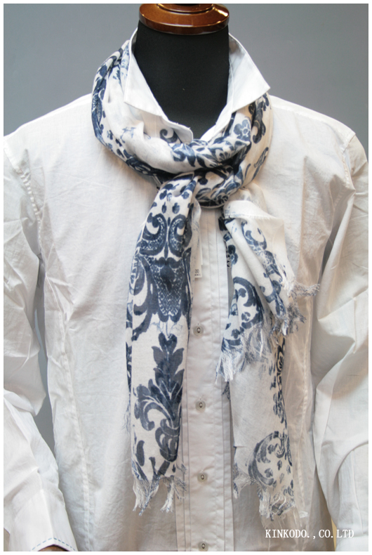 かすれた感じのプリントですがヨーロッパのクラッシックな感じが出ていると思います。昨日のストールもそうですが、色合いは寒色ですが、触りはカシミヤミックスの柔らかく暖かい素材です。