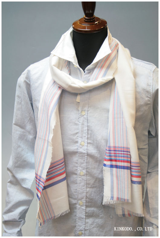 ちょっと角度を変えて。ストールの縦に入っているストライプは色のトーンを抑えて。そして裾の方のストライプをはっきりと出しているストールです。