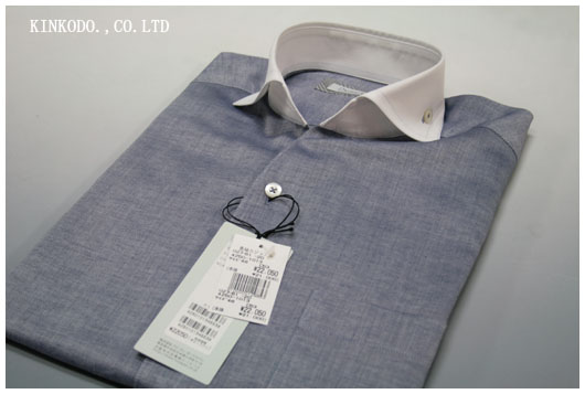 第一ボタンがなくオープン式のシャツです。衿型が変わってます。大きく広がったワイドスプレットで衿台にそのままボタンを付けています。