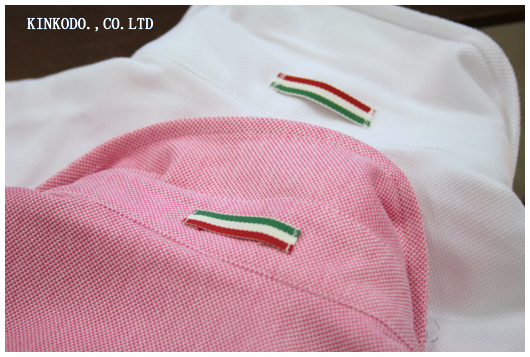 すみません。衿の裏からで。夏になるとポロシャツの衿を立てることってあるじゃないですか。紫外線が強い時。首の後ろが焼けるのを防ぐ為に。そんな時にもお洒落に見えるようにトリコロールカラーのリボンを衿裏に。