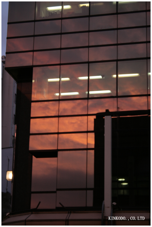 正面ビルに映る夕焼けが綺麗でした。ビルのガラスや建物と夕焼けのコントラストがとても綺麗。