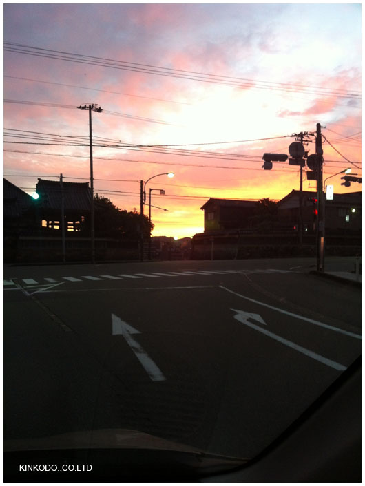 信号待ちでiPhoneで写真を撮りました。写真でどれだけ伝わるか分かりませんが本当に綺麗な朝焼けでした。朝練で何度も朝焼けを見たことがありましたが今日は特別。台風が来るからでしょうか。