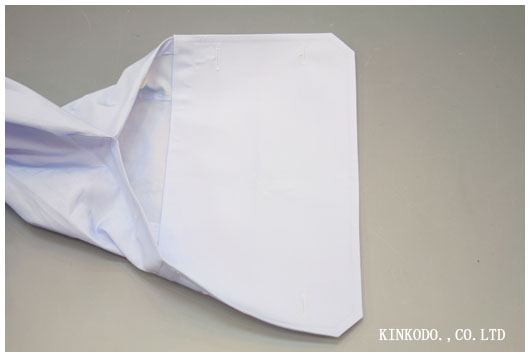 こちらのダブルカフスは折り返しの角を落としたデザインにしています。通常は丸、もしくは直角ですが、このようなデザインも可能です。