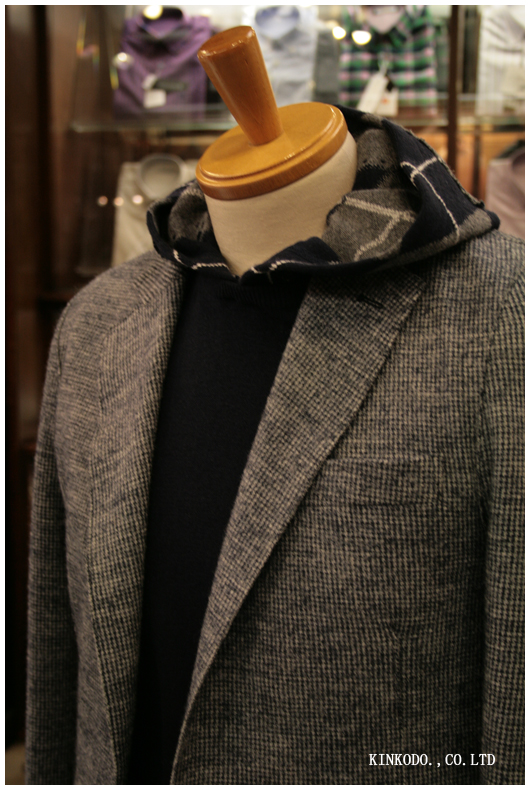 ジャケットにフード付きのセーターを合わせても良いか?というと決してセオリー通りの着こなしではないかも知れませんが。
