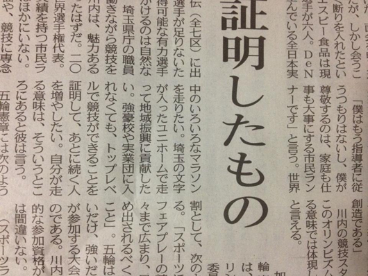 「僕はもう指導者に従うつもりはないし、僕が尊敬するのは、家庭も仕事も大事にする市民ランナーです」と言う。世界中のいろいろなマラソンを走りたい。埼玉の文字が入ったユニホームで走って地域振興に貢献したい。強豪校や実業団に入れなくても、トップレベルで競技ができることを証明して、あとに続く人を増やしたい。自分が生きる意味は、そういうとこにあると彼は言う。