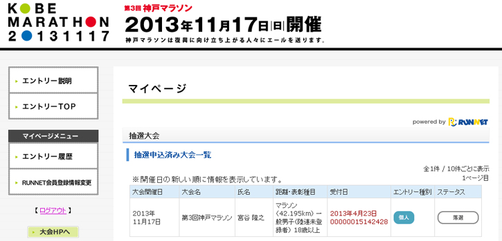 これで東京マラソン7回、大阪神戸3回。京都1回と連続落選記録を更新中です。