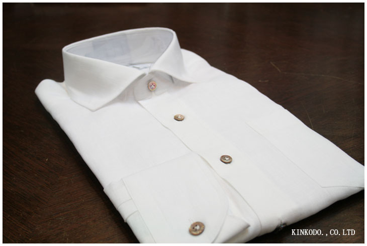 白の麻の生地に茶蝶貝を付けたシャツです。白蝶や黒蝶を付けたことはありましたが、茶蝶貝も麻のシャツの風合いに馴染んで良いものです。