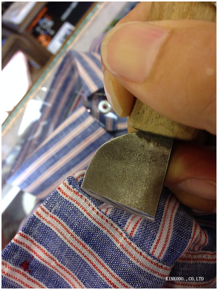 当店の場合は既製品をご購入頂いたお客様で袖の長さが合わないお客様には袖を調整してお渡ししているのですが。先ずは店頭でこのようにカフスと袖を外す作業を致します。最初に刃を入れる時が肝心。