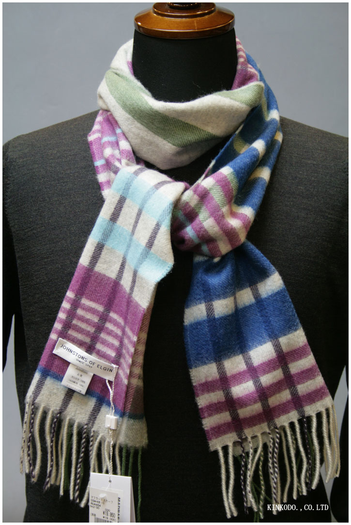 ジョンストンズのパープルのチェックストール。カシミヤ100%です。約25センチ×約178センチの長めのストールです。色違いもございます。