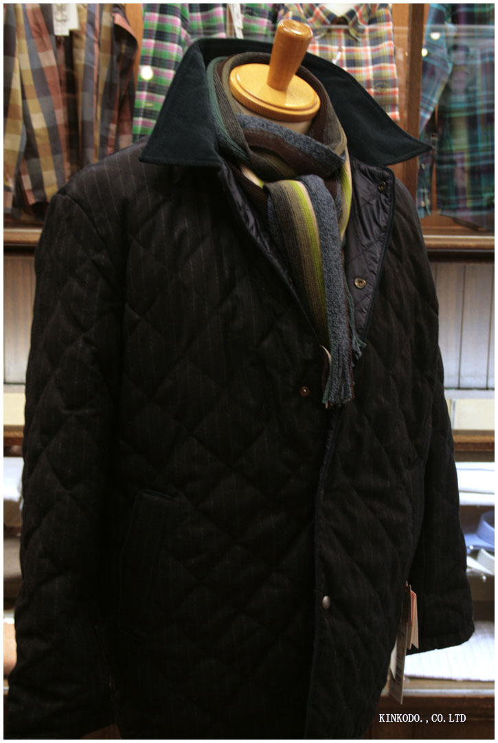 表はウール素材のネイビーのストライプです。衿はコーデュロイ。