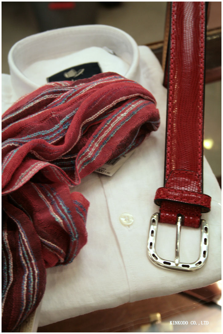 真っ赤なベルトに、真っ赤なストール。これをどうやって合わせるか?これ以上色は増やせないですよね。白のシャツにデニムのパンツ。これで真っ赤な靴を履いてしまうとやり過ぎですから、トップに白のシャツがきているので、白のスニーカーで無難にまとめないと赤が映えません。