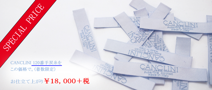 イタリア製の生地でしかも糸番手が120番。通常は2万円を超える価格ですが、今回僅かの着数ですが、18,000+税でご用意できます。上の画像をクリックして頂きますと、カンクリーニの生地にリンクされます。