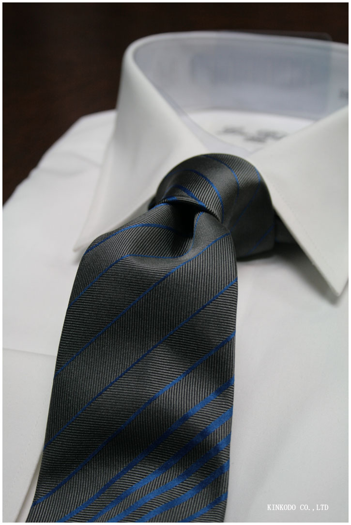 グレーベースにブルーのストライプですが、ブルーのストライプ自体はストライプの巾も変えて、そして間隔もマチマチ。ストライプとストライプの間はツイル(綾織り)になっており立体感もあります。